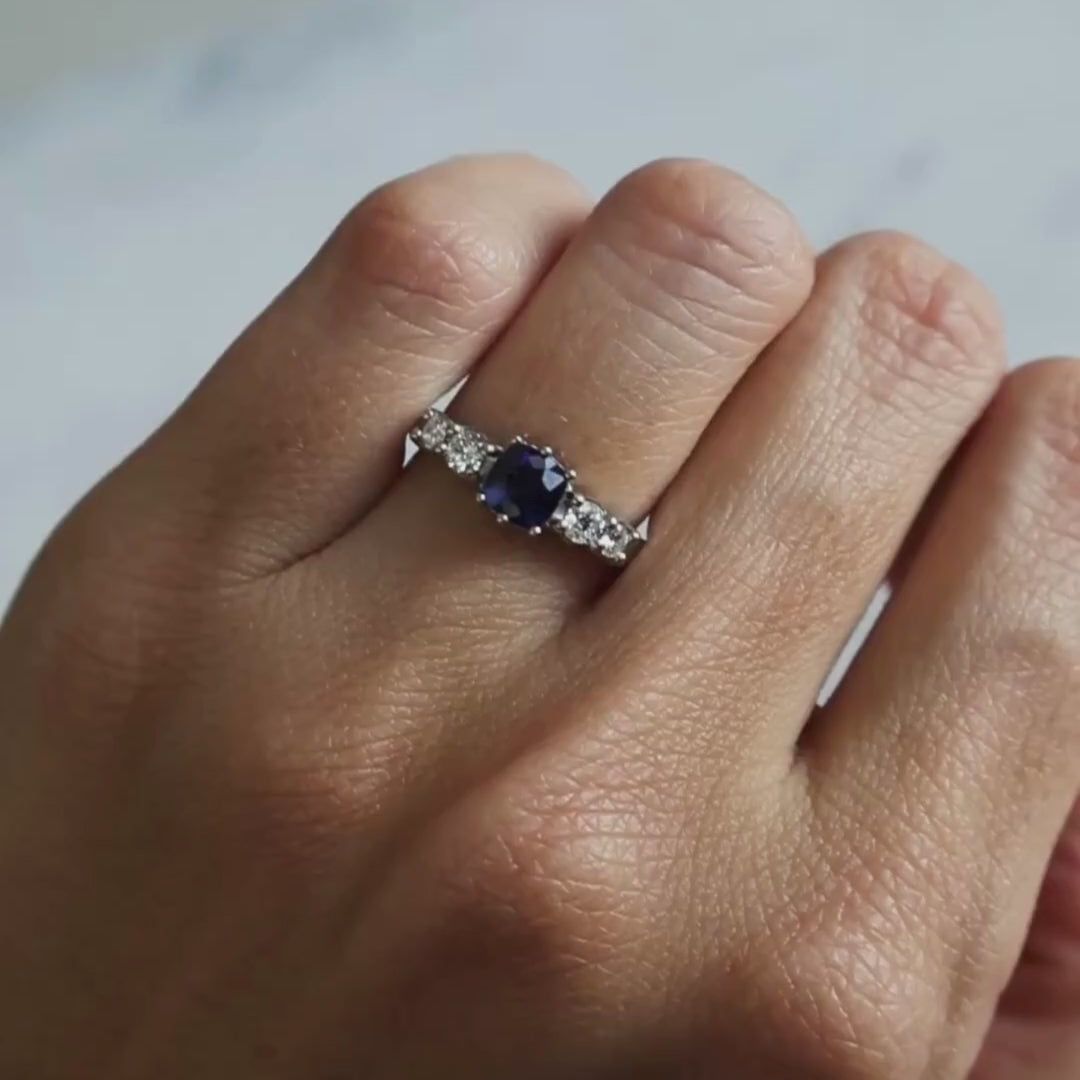 Con un diseño atemporal y una confección a mano, este anillo de compromiso contiene un zafiro central, acompañado a cada lado por cuatro diamantes naturales que realzan su brillo y elegancia, cada piedra ha sido cuidadosamente seleccionada para lograr una armonía perfecta.