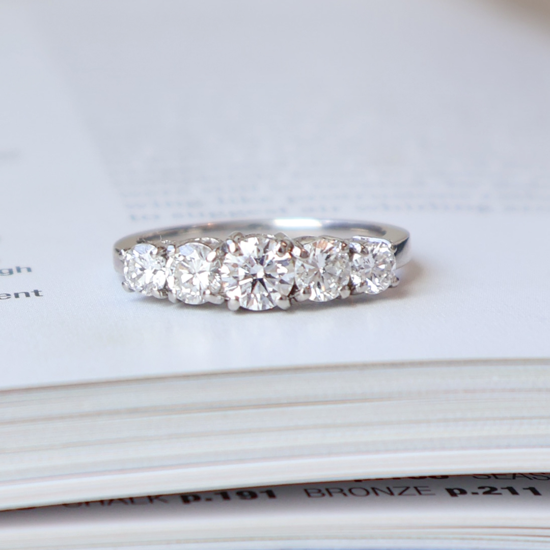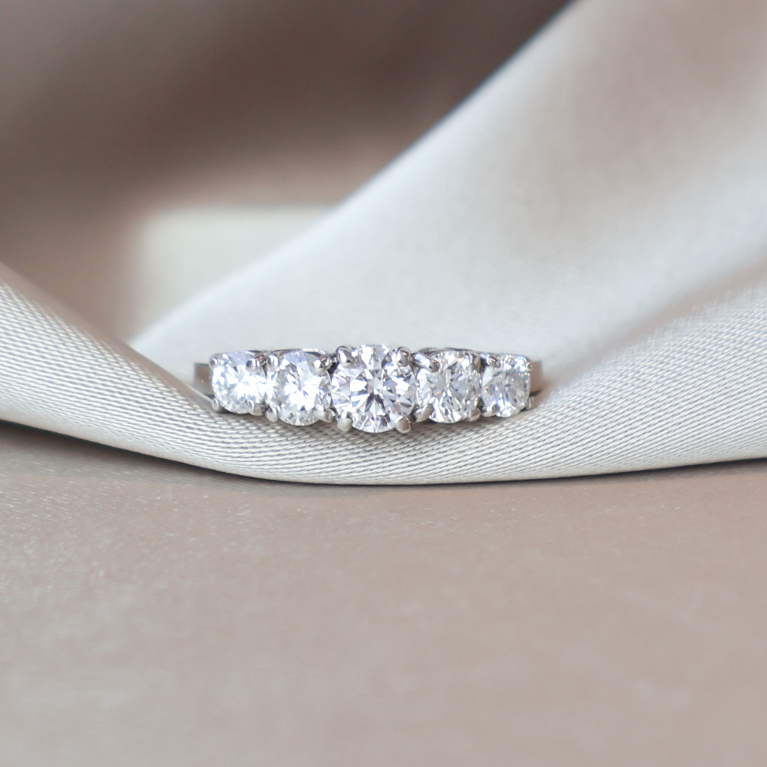 Un par de diamantes de 10 puntos cada uno que acompañan al diamante central de gran tamaño, mientras que en los extremos se encuentran dos diamantes de 8 puntos cada uno.