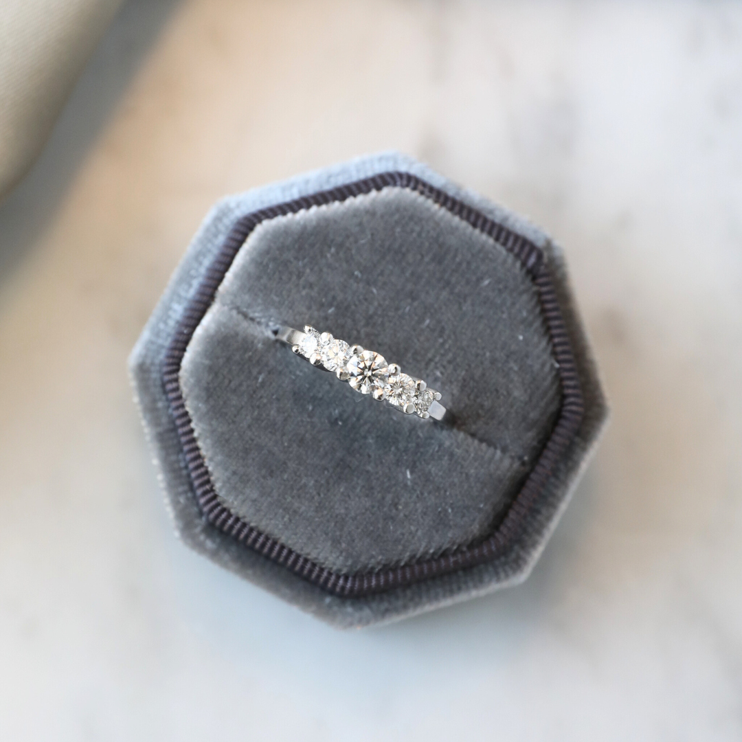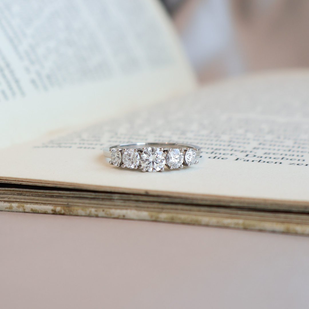 Este precioso quintillo Mia está diseñado para aquellas novias que buscan un estilo llamativo con un brillo único. Contiene una preciosa composición de cinco diamantes corte brillante que se unen para crear un anillo maravilloso.