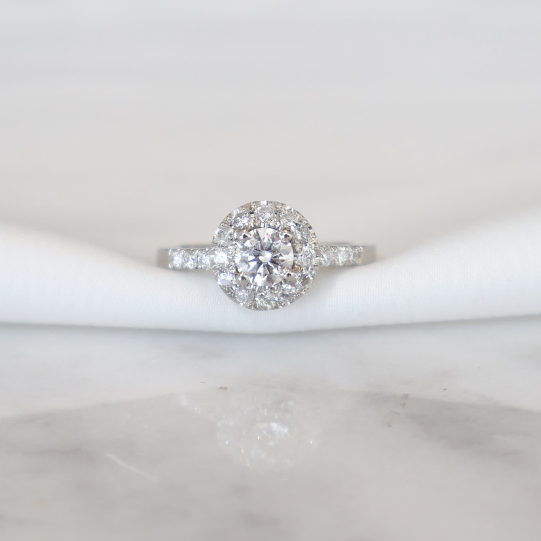 Este anillo contiene un halo de diamantes que rodean el brillante central. Además el cuerpo del anillo cuenta con 12 diamantes corte brillante, que agregan un toque adicional de elegancia y brillo.