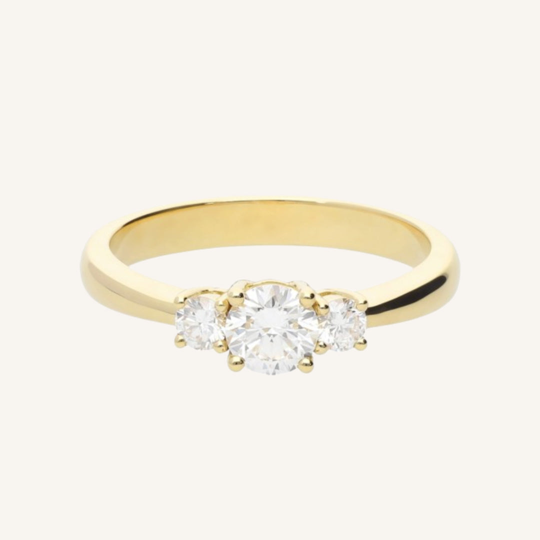 Este anillo solitario trilogía está fabricado en oro amarillo y tiene un diseño clásico y atemporal. El anillo tiene un diamante central engastado con cuatro grapas, creando una armonía perfecta de brillo y proporción. Es una joya cargada de simbolismo —pasado, presente y futuro— ideal para celebraciones significativas o como anillo de compromiso. Su estilo elegante y delicado lo convierte en un icono de elegancia para la mujer contemporánea.