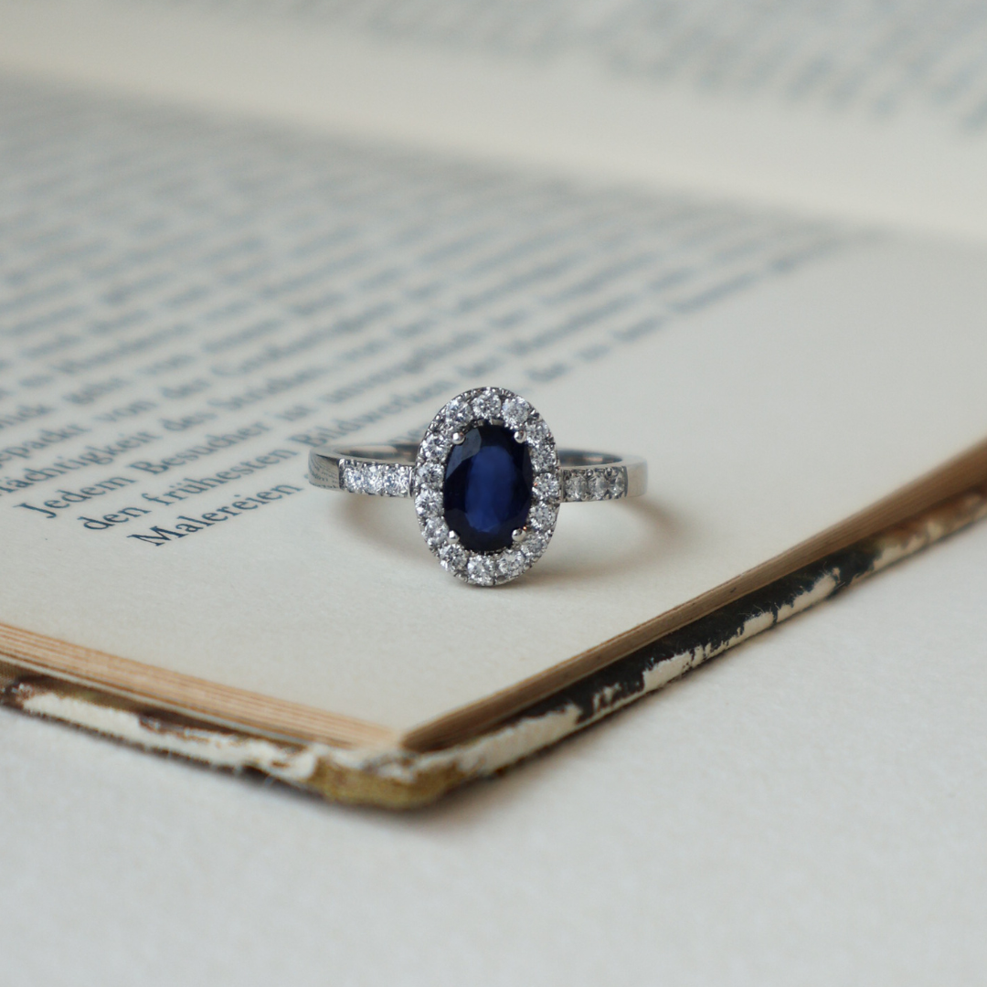 Este elegante anillo tiene un zafiro ovalado azul central, rodeado por diamantes brillantes. El contraste entre el profundo azul del zafiro y el brillo de los diamantes crea una armonía perfecta. La piedra está montada en una delicada estructura de Platino, garantizando durabilidad y elegancia.